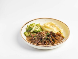 Тушеная говядина с шампиньонами, луком и сливками с соусом демиглас. Подается с картофельным пюре (картофель, сливки). Сервируется свежими огурцами под азиатским соусом