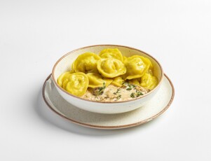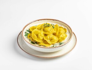 Пельмени подаются со сливочным маслом и со сливочно- грибным соусом (шампиньоны, чеснок, трюфельное масло, белые грибы, лук репчатый, белое вино, сливки, соль, перец, масло растительное). Пельмени ручной работы. Состав пельменей: курица, индейка, жареный лук репчатый, соль, перец, куркума.