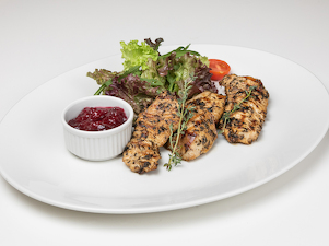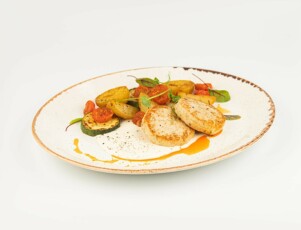 Медальоны из филе индейки, приготовленные в формате су-вид и обжаренные на гриле. Украшаются миксом салатов и помидорами черри, подаем с клюквенным соусом