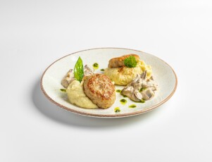 Фирменные котлетки (филе курицы и индейки, яйцо, лук, хлеб, молоко) с картофельным пюре (картофель, сливки) и соусом из шампиньонов, репчатого лука и сливок
