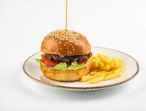 Бургер с говяжьей котлетой, листом салата, свежим томатом, соленым огурчиком и соусом барбекю