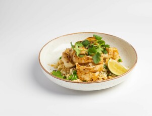 Нежный кальмар в соусе том ям, подаем с рисом, обжаренным по-азиатски с яйцом, луком, зеленым горошком и специями.