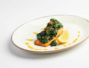 Классический стейк из мурманской форели с оригинальным соусом из шпината, обжаренного с золотистым луком на сливочном масле.