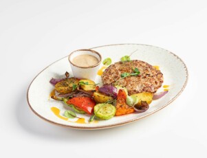 Рубленая котлета (мясо курицы, индейки,говядина). Подается с поджаренными овощами (болгарский перец, цукини, красный лук, бэби-картофель). Подаем с кресс зеленью и ароматным маслом чили.
