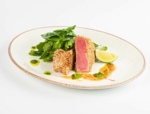 Тунец, приготовленный на растительном масле в соевом соусе с белым кунжутом. Подается с гарниром из шпината, соусом свит-чили, каплями песто, кресс- щавелем, и долькой лайма.