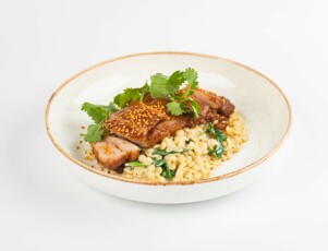 Куриное бедро, приготовленное в формате су-вид, обжаренное на растительном масле с луком. Подаем с пастой птитим и шпинатом, с соевым соусом с добавлением сливок. Украшается кунжутом юдзу и свежей кинзой.