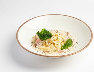 Паста с обжаренным луком-шалотом, беконом и сливочным соусом с добавлением яичного желтка. Подается с ароматными луковыми чипсами.
