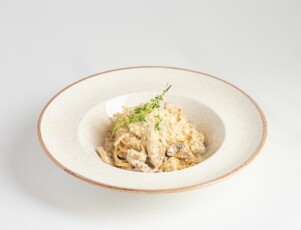Спагетти с запеченным куриным филе, обжаренными шампиньонами, репчатым луком и густым сливочным соусом. Подается с сыром пармезан.