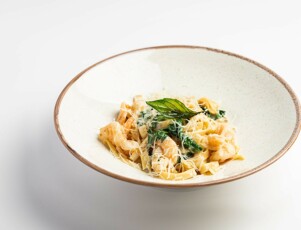 Паста Фетучини с обжаренными на растительном и сливочном масле креветками, с добавлением репчатого лука, белого вина, сливок и рубленого чеснока.