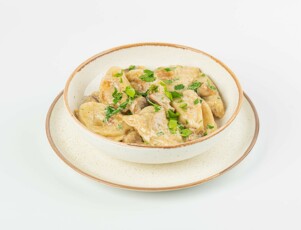 Вареники ручной лепки с начинкой из картофеля, белых грибов и шампиньонов. Подаем с соусом из обжаренных в сливках шампиньонов и трюфельным маслом