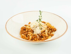 Спагетти, приготовленные с соусом болоньезе (говяжий фарш, репчатый лук, болгарский перец, морковь, чеснок, сельдерей, томаты в собственном соку, соль, перец). Подается с сыром пармезан и свежим тимьяном