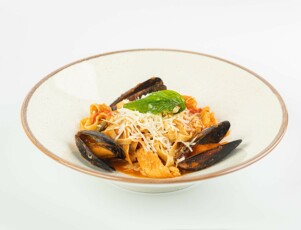 Фетучини с соусом из креветок, мидий и кальмара с добавлением томатов в собственном соку, печеного лука и дробленого перца. Подется с сыром пармезан и чипсом базилика