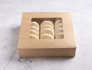 Состав: фарш (говядина, мясо цыплят-бройлеров, вода питьевая, сливки питьевые, лук репчатый свежий, соль, перец душистый молотый), тесто (мука пшеничная в/с, вода питьевая, меланж яичный, масло подсолнечное, соль)