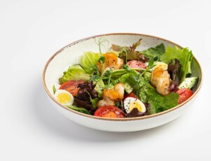 Смесь салатов, помидоры черри, свежие огурцы, отварные перепелиные яйца, жареные креветки (обжариваются на оливковом масле с тимьяном и чесноком).