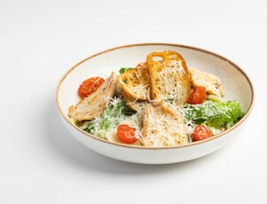 Свежие листья салата с маринованной в масле с тимьяном жареной куриной грудкой, помидорами черри и хрустящими светлыми крутонами, заправлен оригинальным соусом "Цезарь". Посыпан ароматным сыром "Пармезан".