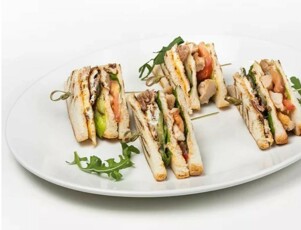 Аппетитный сэндвич из формового хлеба с нежной куриной грудкой, хрустящим беконом, жареным яйцом, сочными листьями салата ромейн, свежими помидорами, соленым огурцом и фирменным соусом «Тысяча островов».