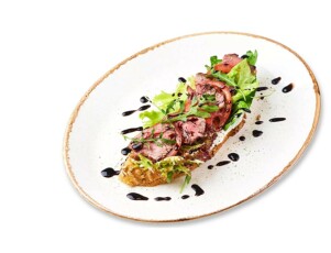 Подсушенный деревенский хлеб с семечками с муссом из сливочного сыра, миксом салатов, сочным запеченным ростбифом и свежими помидорами. Украшается крем-бальзамиком