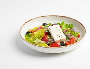 Классический салат из свежих томатов, огурцов и болгарского перца с сочными листьями салата, маслинами без косточек и нежным сыром Фета. Заправлен греческим соусом на основе оливкового масла с добавлением лимонного сока и прованских трав