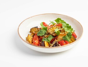 Баклажаны обжариваются во фритюре, смешиваются со свежими томатами, заправкой из соуса на основе свит чили и устричного. Украшаются дробленым арахисом и свежей кинзой