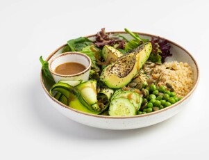 Листья салатов с добавлением цукини, огурцов, авокадо, зеленого горшка и киноа в цитрусовом соусе (мёд, лайм и апельсин). Украшается жареными семечками тыквы и подсолнечника и семенами чиа