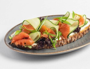 Слабосоленый лосось на деревенском хлебе со сливочным сыром, свежим огурцом и перышками зеленого лука