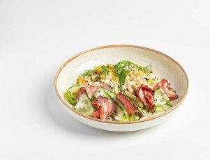 Авторская версия оливье: картофель и морковь, запеченные, огурцы соленые, зеленый горошек, отварное яйцо. Сервируется ломтиками ростбифа и свежим огурцом под соусом гамадари