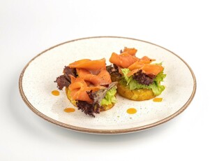 Драники (картофель, мука, сметана, лук репчатый, яйцо, соль, перец), обжаренные на растительном масле. Подаются с пюре из авокадо, свежей рукколой, сыром креметте и слабосоленой форелью.