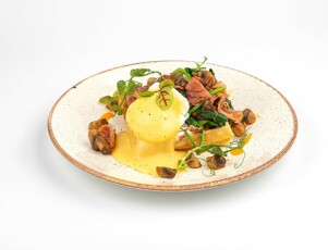 Хрустящая теплая вафля с нежным сливочным муссом из сыра креметте, сервируется теплой начинкой из обжаренных шампиньонов с беконом и шпинатом