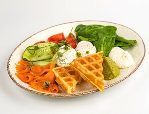 Сытный завтрак с бельгийской вафлей, скремблом из 2 яиц, свежими овощами, печеным картофелем и томатом + ростбиф / форель / парма по вашему выбору