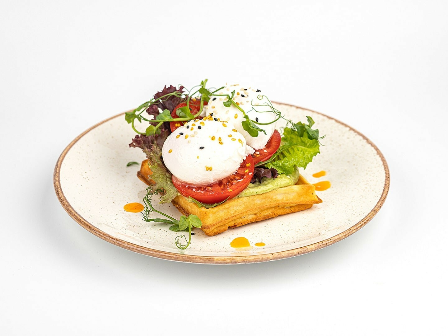 Хрустящая теплая вафля с нежным муссом из авокадо и сливочного сыра (готовится с каплей лимонного сока!), сочными томатами, свежими салатными листьями, подается с двумя яйцами-пашот, украшается кунжутом юдзу, маслом чили и микро зеленью.