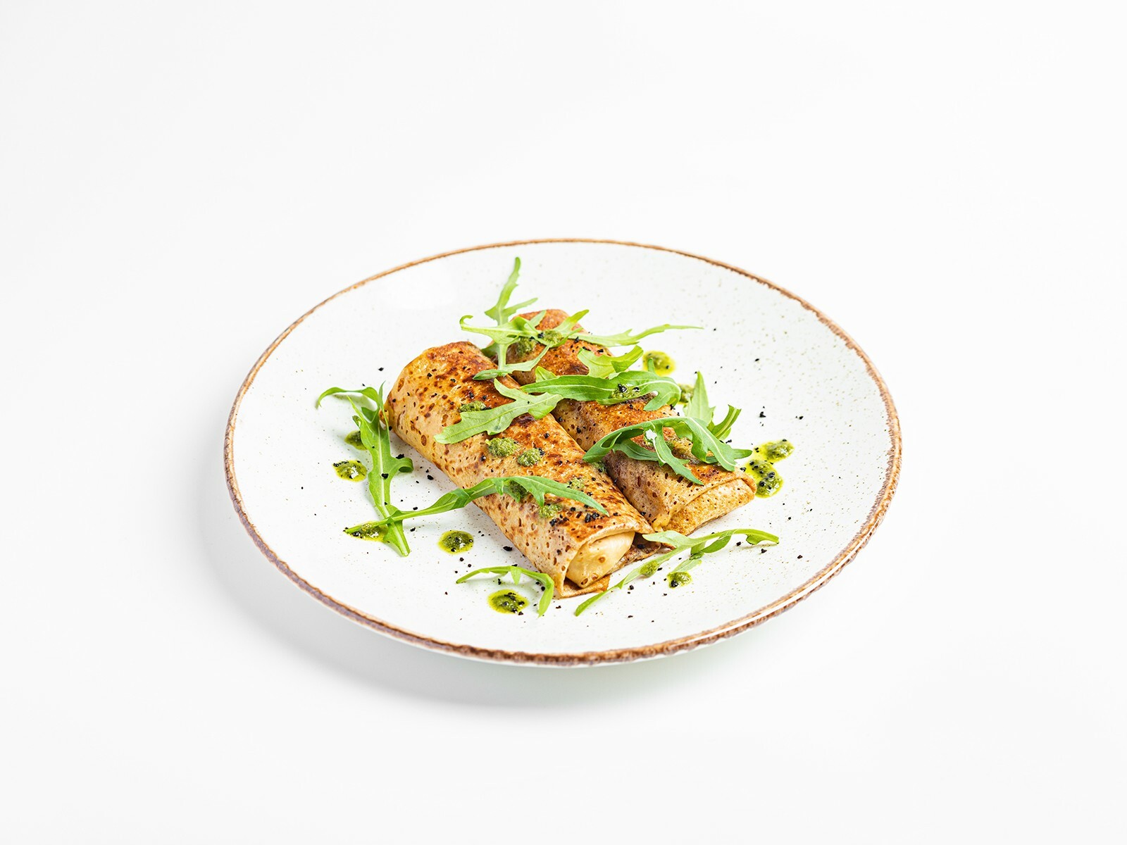 Два блинчика с начинкой из куриного филе с сыром фета.
