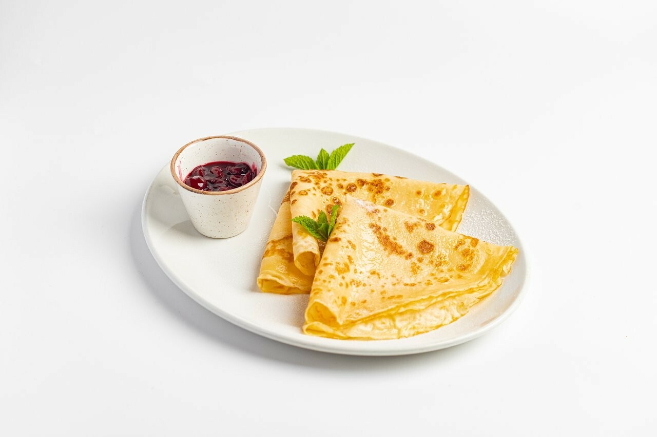 Два блинчика (мука, молоко, яйцо, растительное масло, сахар, соль) с вишневым соусом собственного приготовления (вишня, сахар, крахмал).