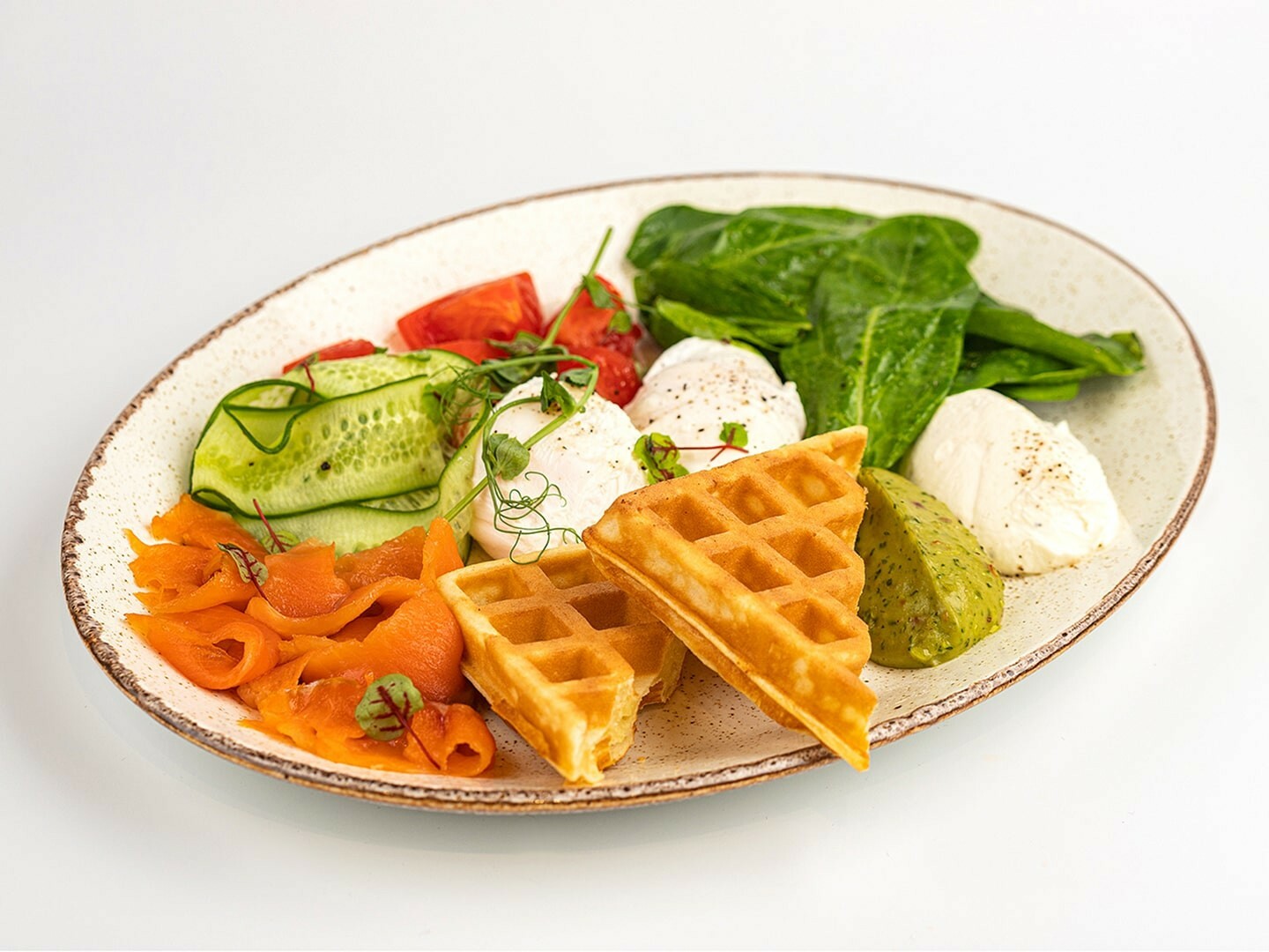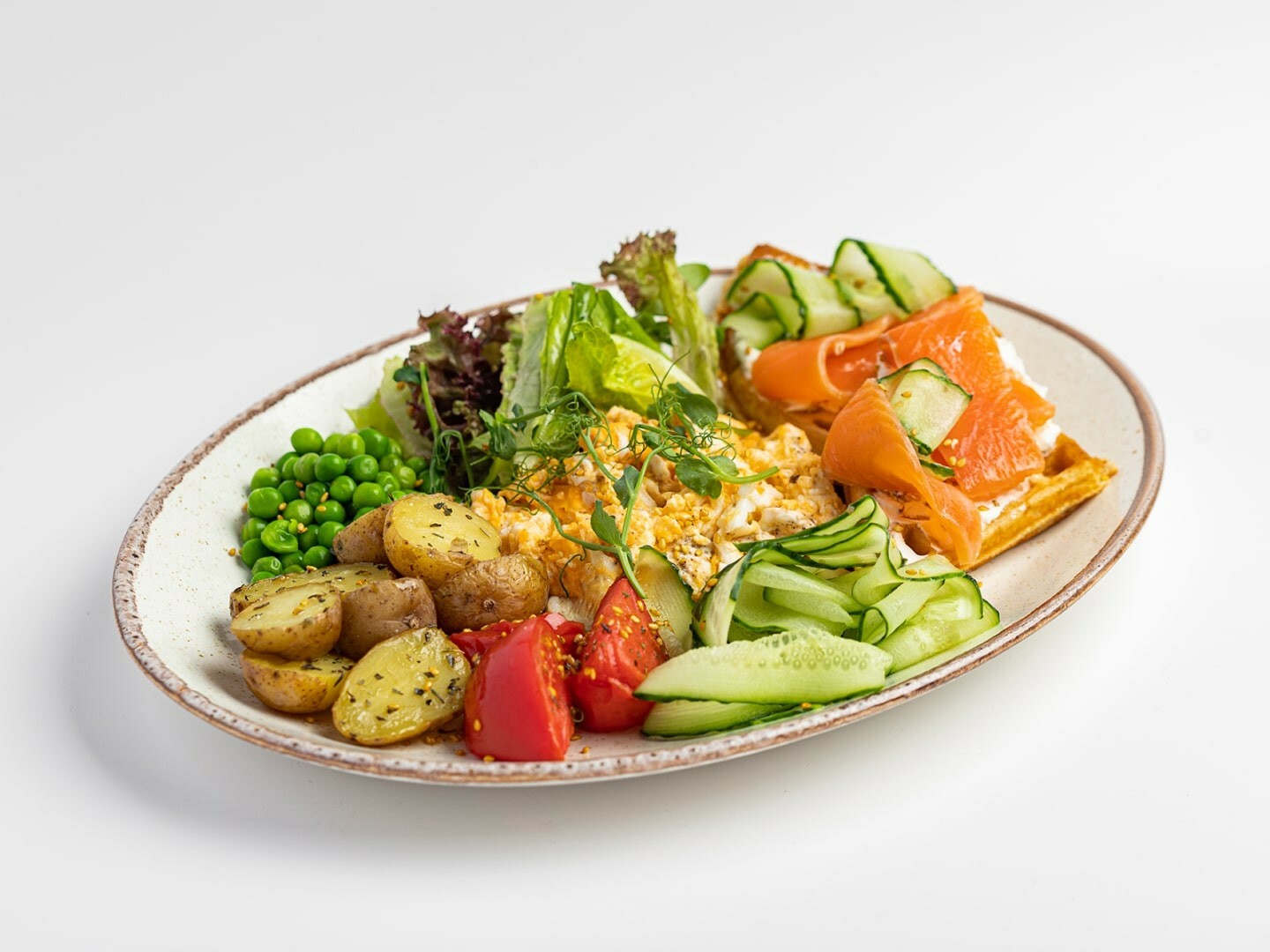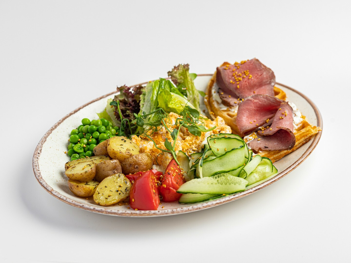 Сытный завтрак с бельгийской вафлей, скремблом из 2 яиц, свежими овощами, печеным картофелем и томатом + ростбиф / форель / парма по вашему выбору.