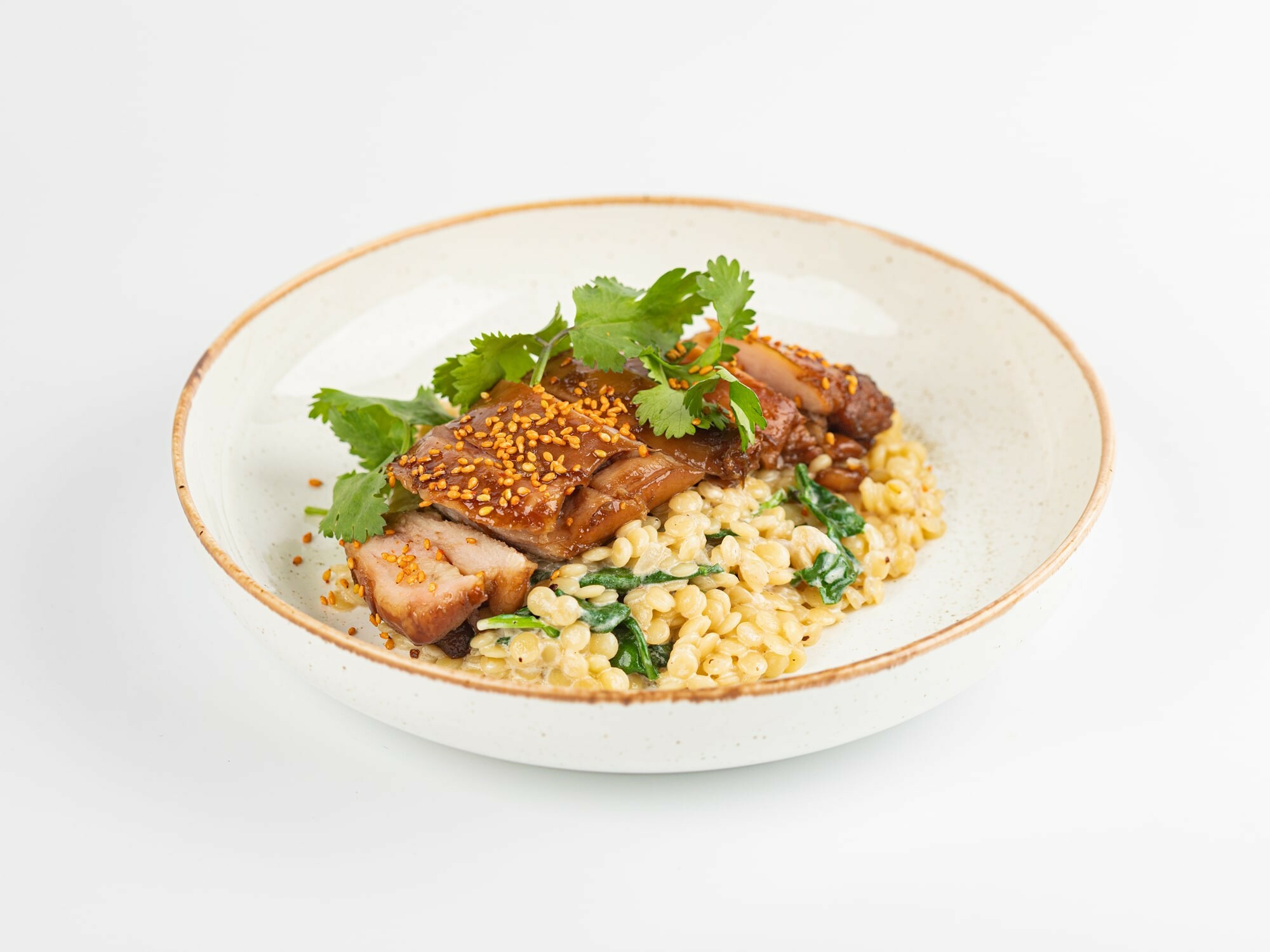 Куриное бедро, приготовленное в формате су-вид, обжаренное на растительном масле с луком. Подаем с пастой птитим и шпинатом, с соевым соусом с добавлением сливок. Украшается кунжутом юдзу и свежей кинзой.