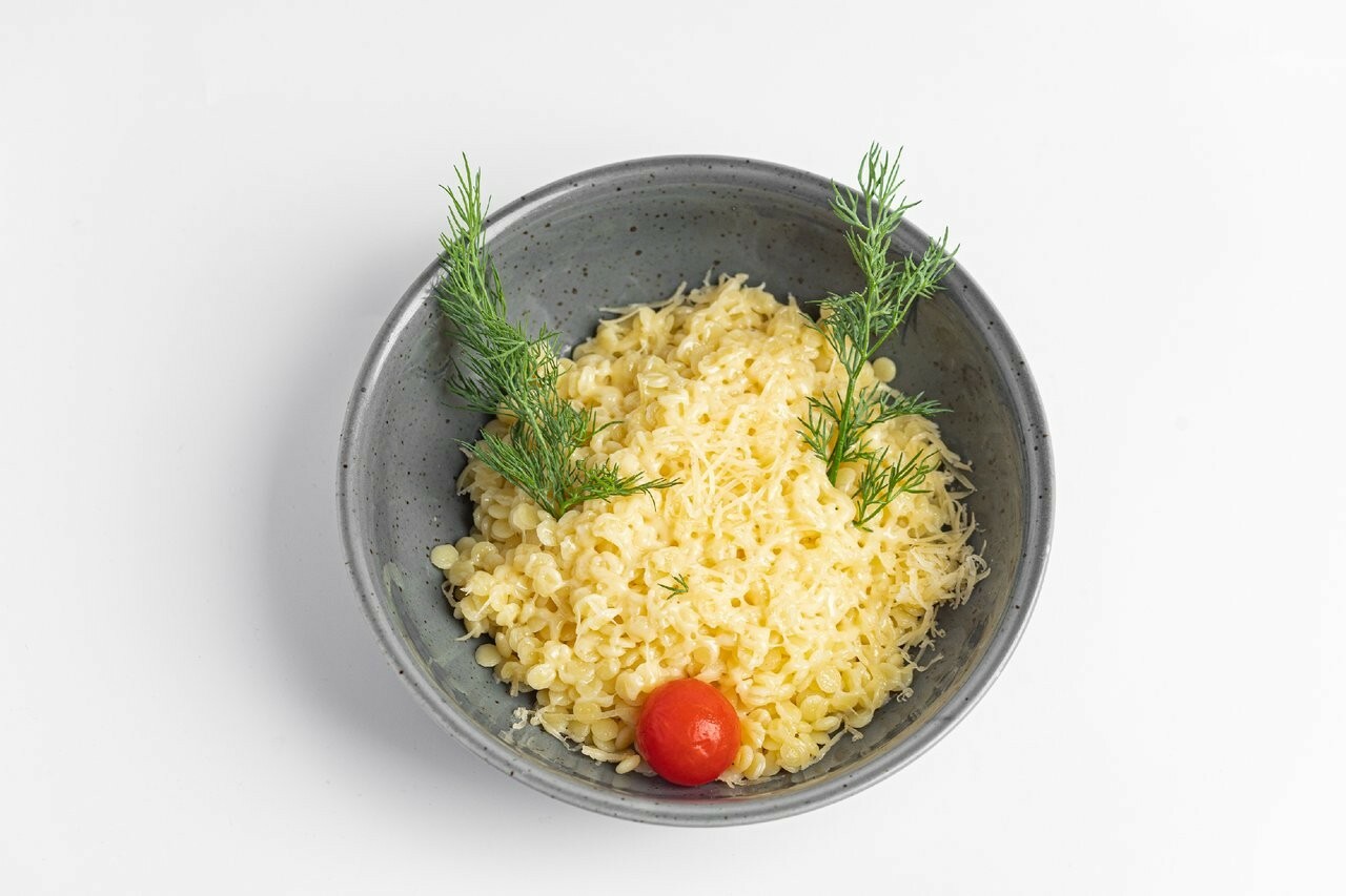 Отварная паста птитим с сыром Гауда и помидорами Черри.