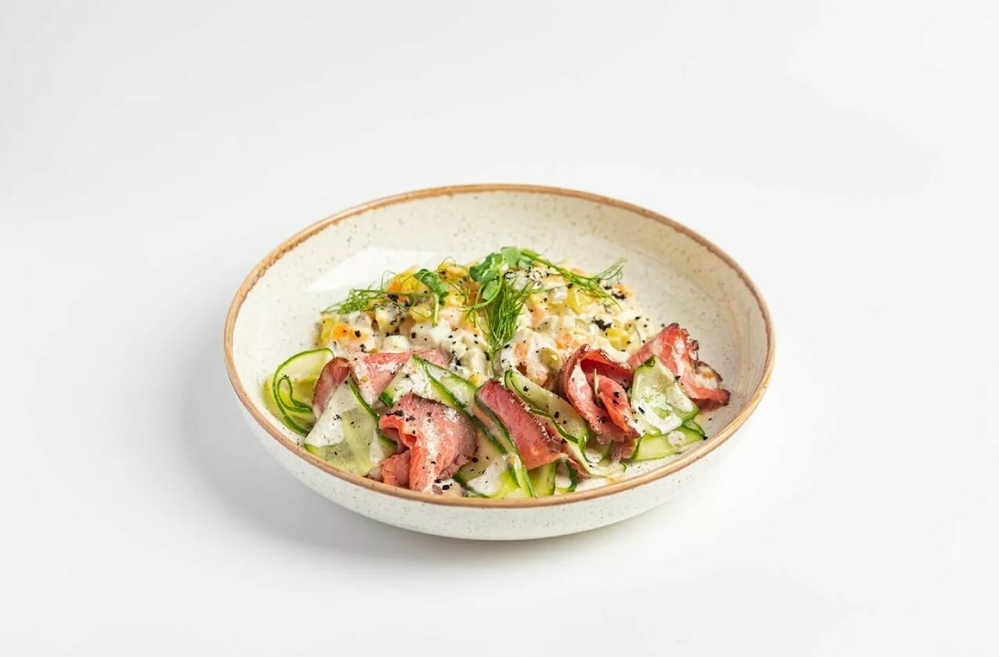 Авторская версия оливье: картофель и морковь, запеченные, огурцы соленые, зеленый горошек, отварное яйцо. Сервируется ломтиками ростбифа и свежим огурцом под соусом гамадари
