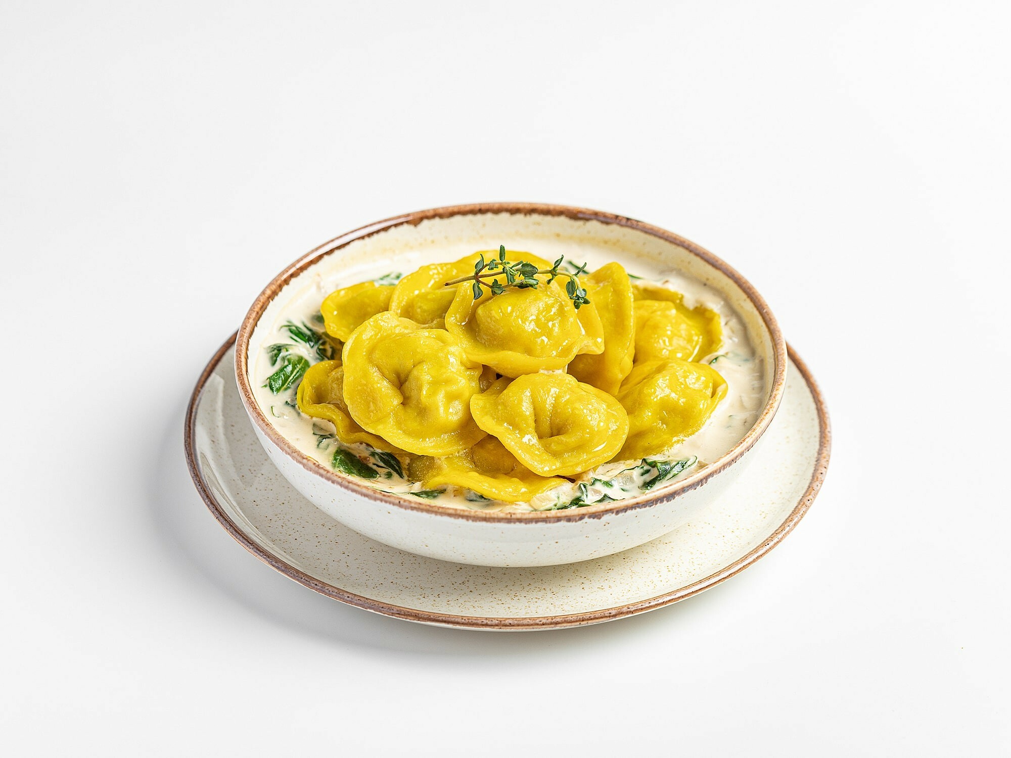 Пельмени подаются со сливочным маслом и шпинатным соусом (свежий шпинат, чеснок, лук репчатый, сливочное масло, белое вино, сливки 22%). Пельмени ручной работы.