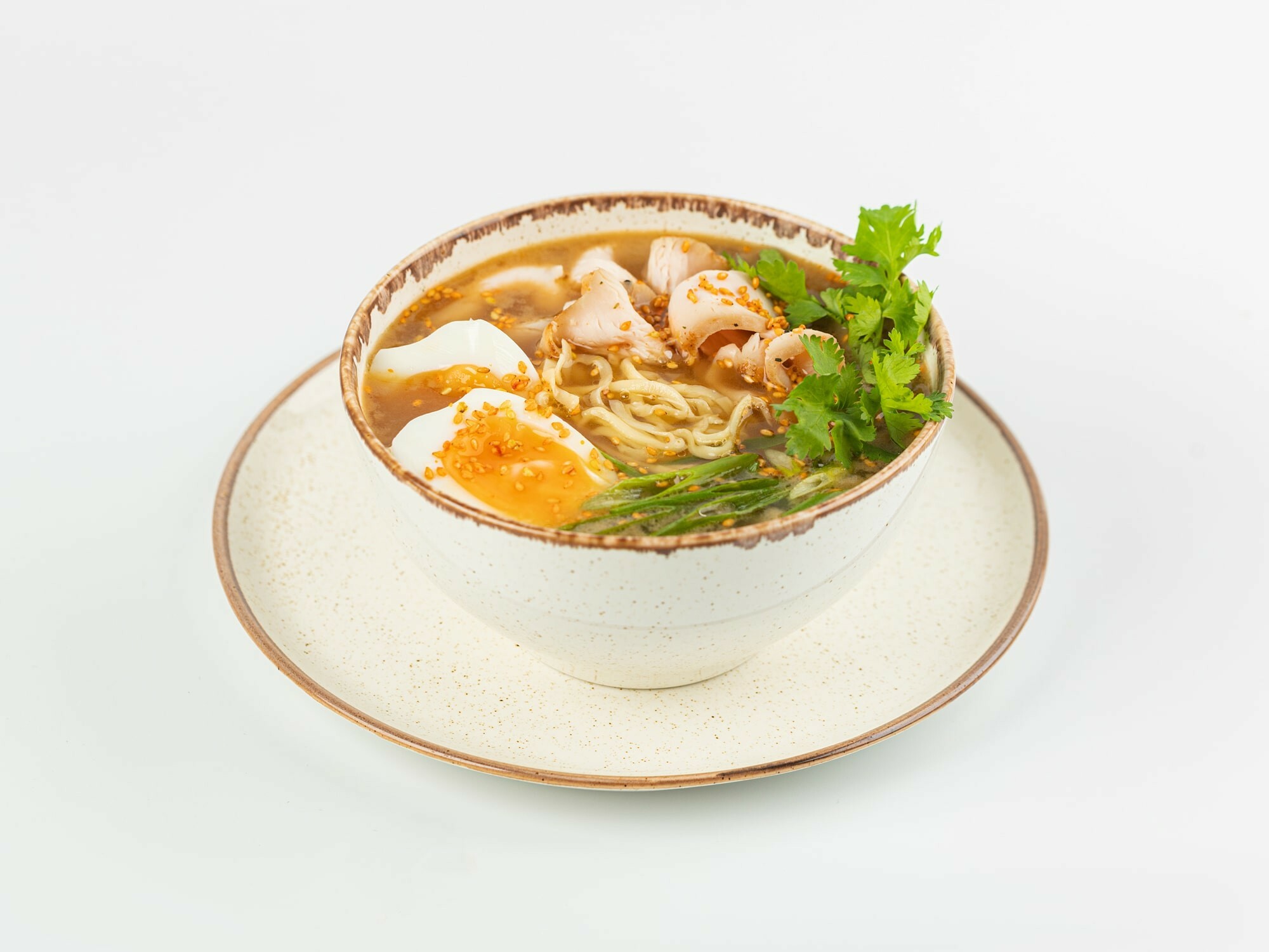 Классический азиатский суп приготовленный на курином бультоне с мисо-пастой, яичной лапшой и запеченной индейкой. Подаем с половинкой куриного яйца, кунжутом юдзу, кинзой и зеленым луком.