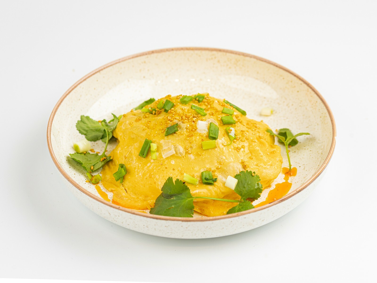 Рис, обжаренный с кальмаром и овощами (цукини, морковь, лук) с добавлением куриного бульона, соуса Кимчи, рыбного соуса и чесночного масла. Сервируется омлетом, подаем с кунжутом Юдзу, перьями зеленого лука и чипсами тунцаю