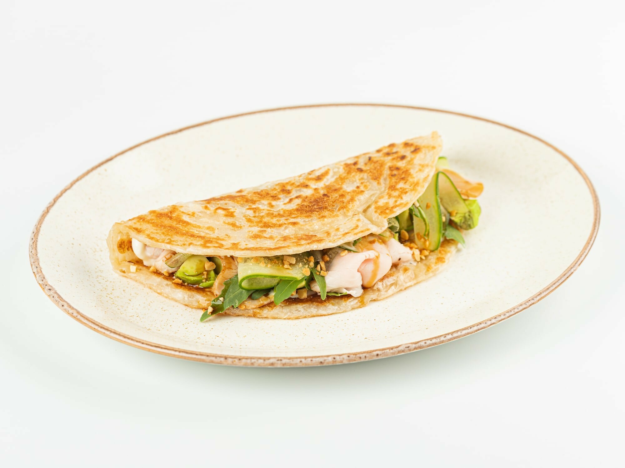 Лепешка роти (мука, сливочное масло, сахар, соль) с со сливочно-сырным соусом (молоко, сливки, сыр пармезан) и начинкой из авокадо, огурца, индейки су-вид, свежей рукколы. Подается с дробленым арахисом и соусом унаги.