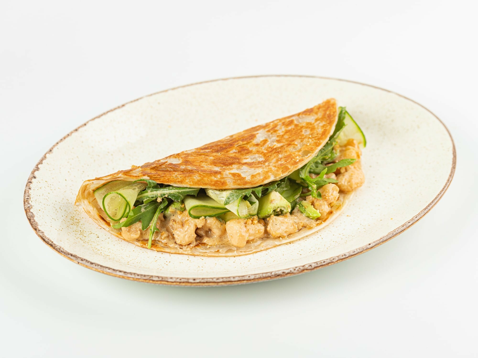Лепешка роти (мука, сливочное масло, сахар, соль) с со сливочно-сырным соусом (молоко, сливки, сыр пармезан) и начинкой из креветок (замаринованных с розмарином и чесноком и обжаренных с луком в белом вине и устричном соусе), авокадо, огурца и рукколы. Подается с дробленым арахисом.