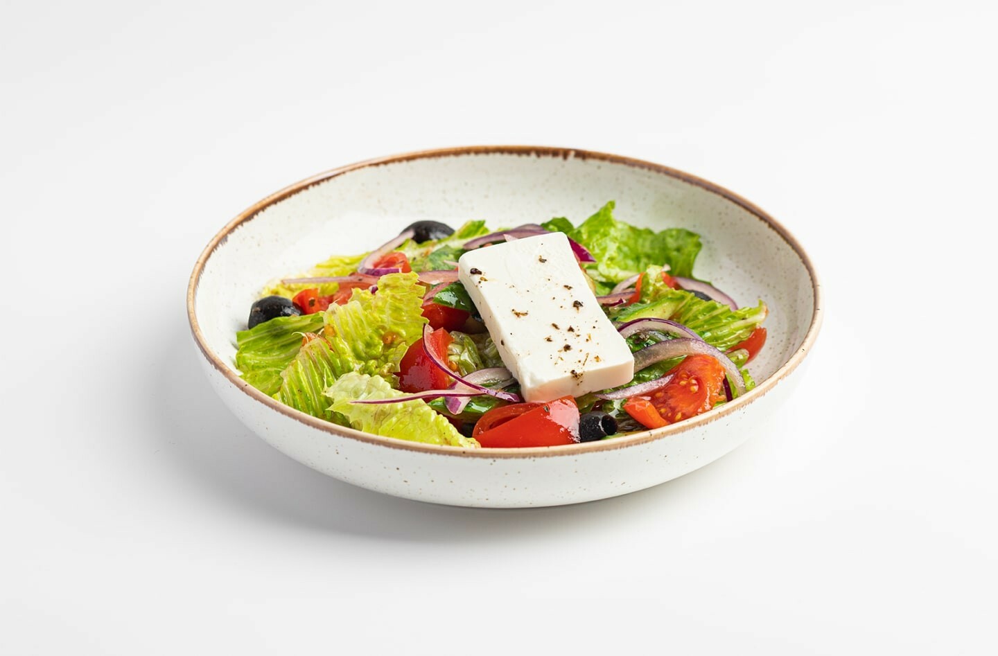 Классический салат из свежих томатов, огурцов и болгарского перца с сочными листьями салата, маслинами без косточек и нежным сыром Фета. Заправлен греческим соусом на основе оливкового масла с добавлением лимонного сока и прованских трав.