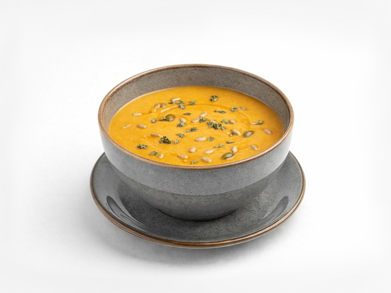 Суп из тыквы, запеченной со свежим чесноком, розмарином и тимьяном, с добавлением моркови, лука чеснока, оливкового масла и кокосового молока. Подаем с семечками подсолнечника и тыквы, семенами чиа, веточкой тимьяна и маслом Чили.