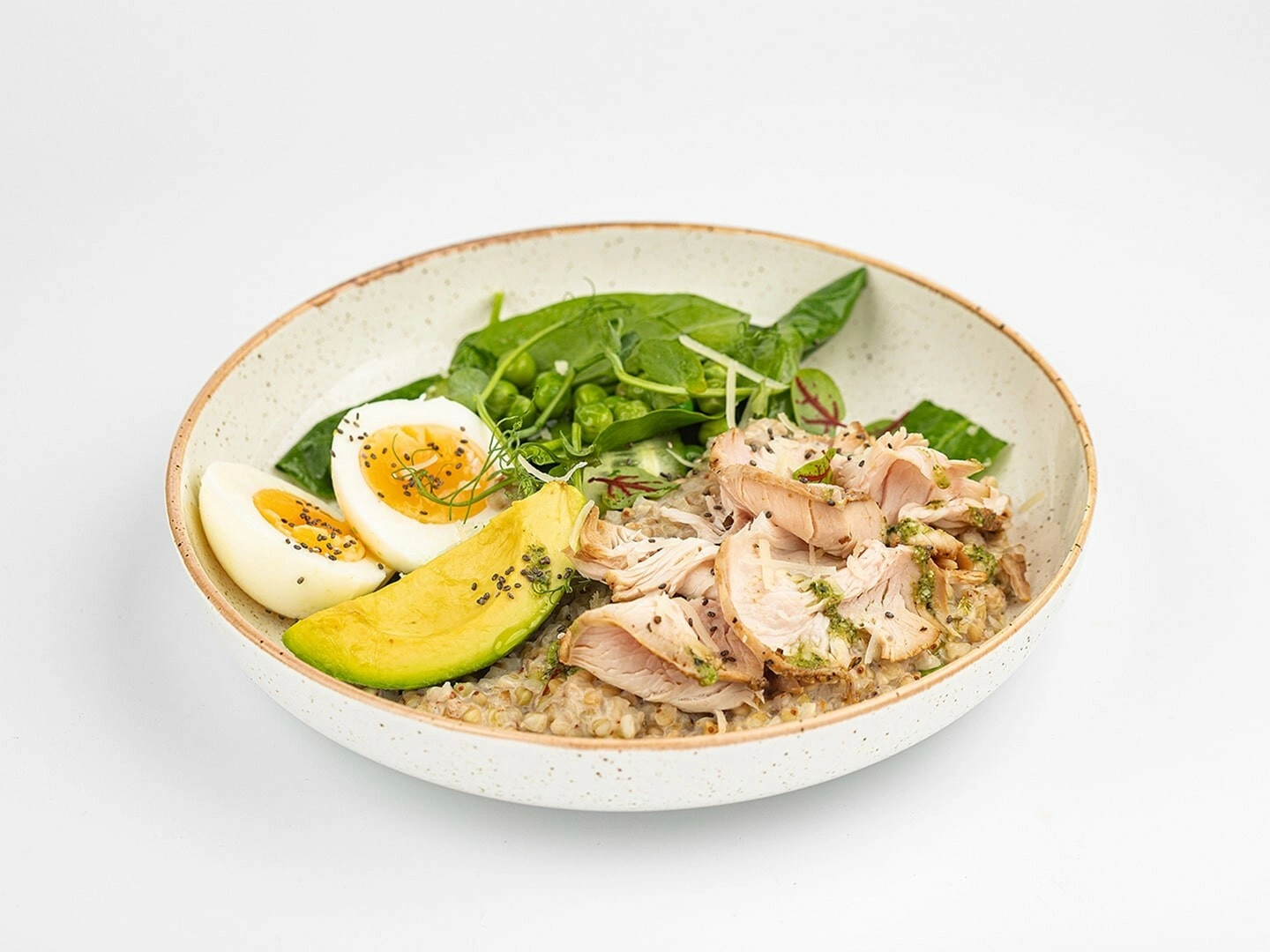 Зеленая гречка (приготовлена на курином бульоне) с сыром Пармезан и сливочным плавленым сыром. Сервируется миксом из листьев шпината, огурца и зеленого горошка в греческом соусе (оливковое масло, лимонный сок, соль, перец, прованские травы). Подается с долькой авокадо и яйцом-пятиминуткой, украшается соусом песто и семенами чиа.