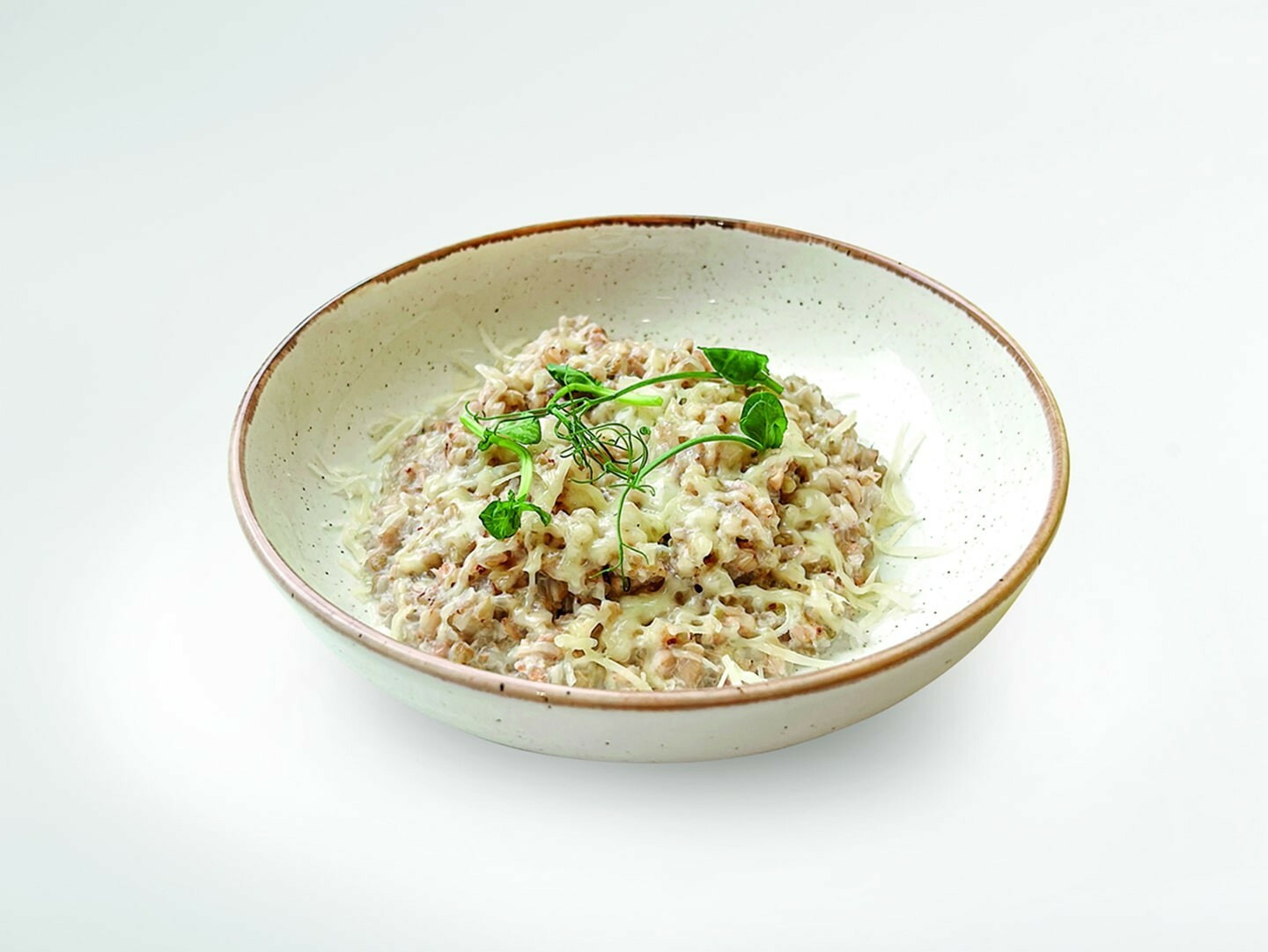 Зеленая гречка, отваренная аль денте, подается с сыром пармезан и микрозеленью.